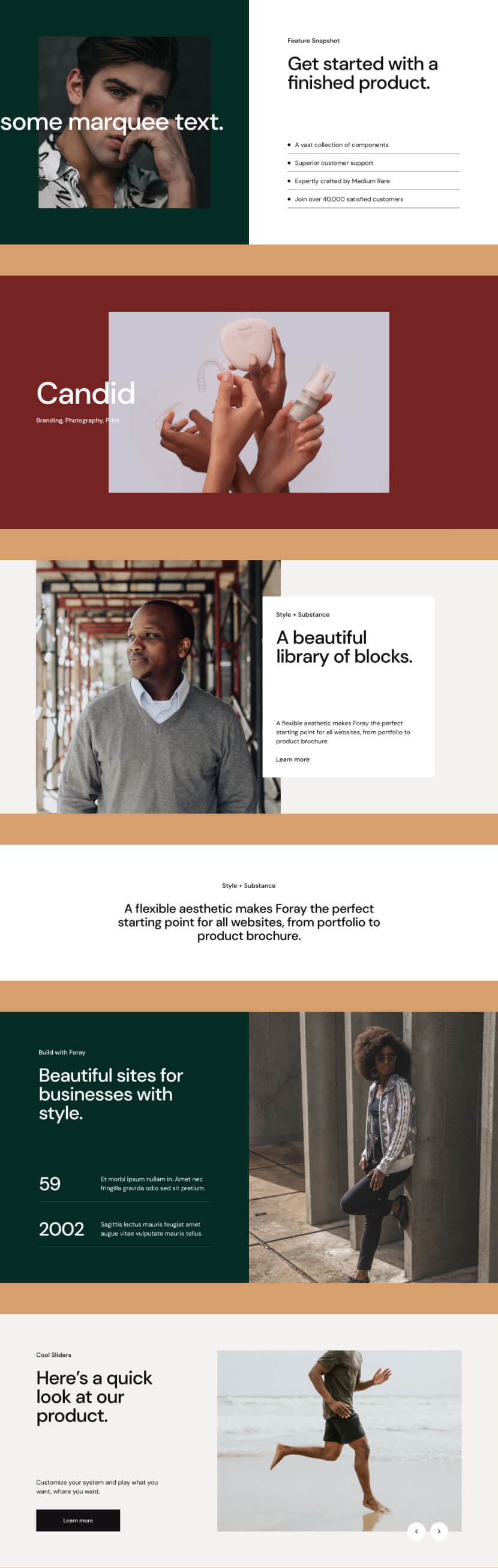 Each category of blocks comprises multiple style options so you will always find a section to suit the needs of your venture.